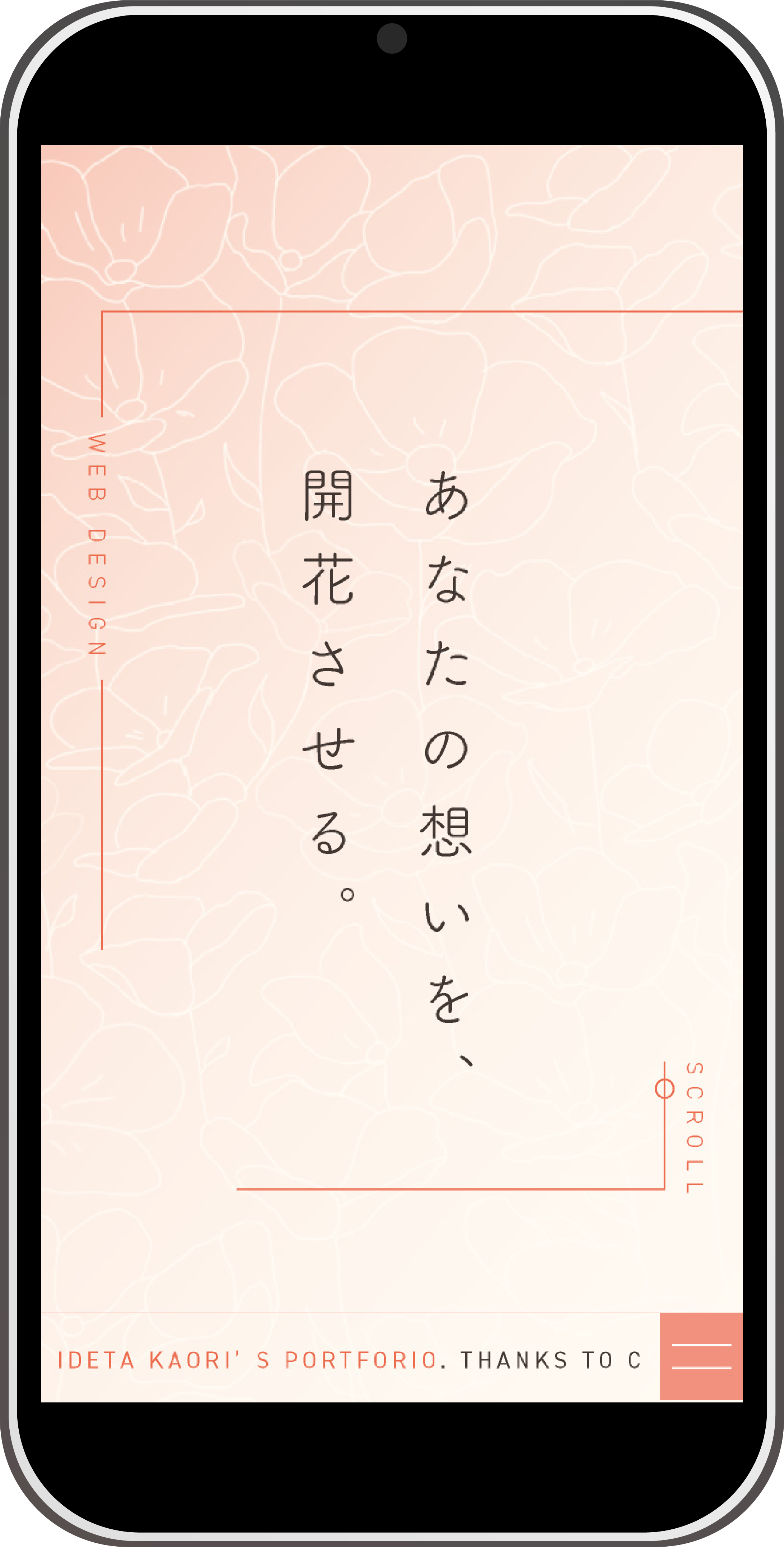 「お客様やユーザーが課題を解決した時に垣間見える笑顔を、デザイン制作で引き出し、まるで蕾から花が開くようにお付き合いしていく」ことが私のコンセプトであり、ポートフォリオサイト全体を通して表現。「TOP」「ABOUT