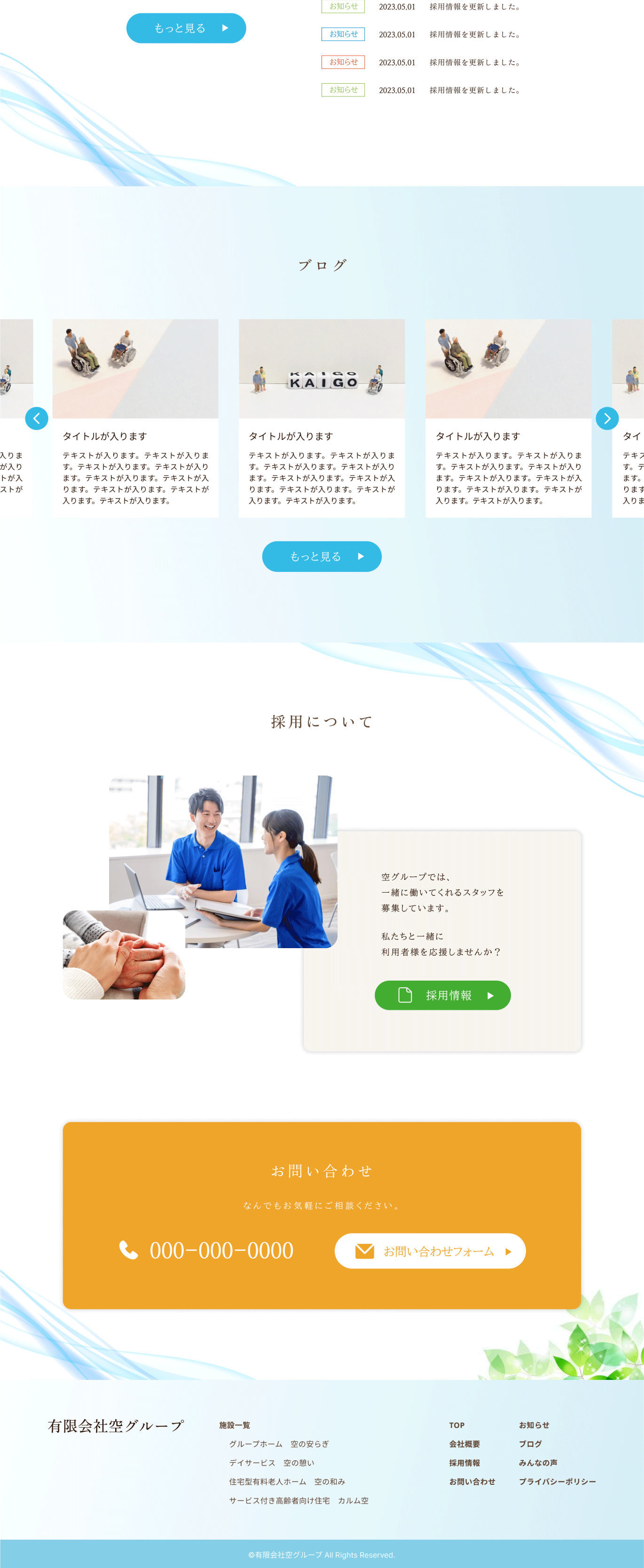 採用に焦点が当たるように工夫した。 「お問い合わせ」の部分を1番目立つ色(橙色)とし、追従ヘッダーにも電話番号を追加することで閲覧時にいつでもコンタクトを取れるように設計。 ヘッダーの「採用情報・お問い合わせ」ボタンは背景とコントラストをつけて目を引くように。 メインビジュアル内に、採用関係のお知らせを1つだけ常に掲載することで、積極採用をアピールする。