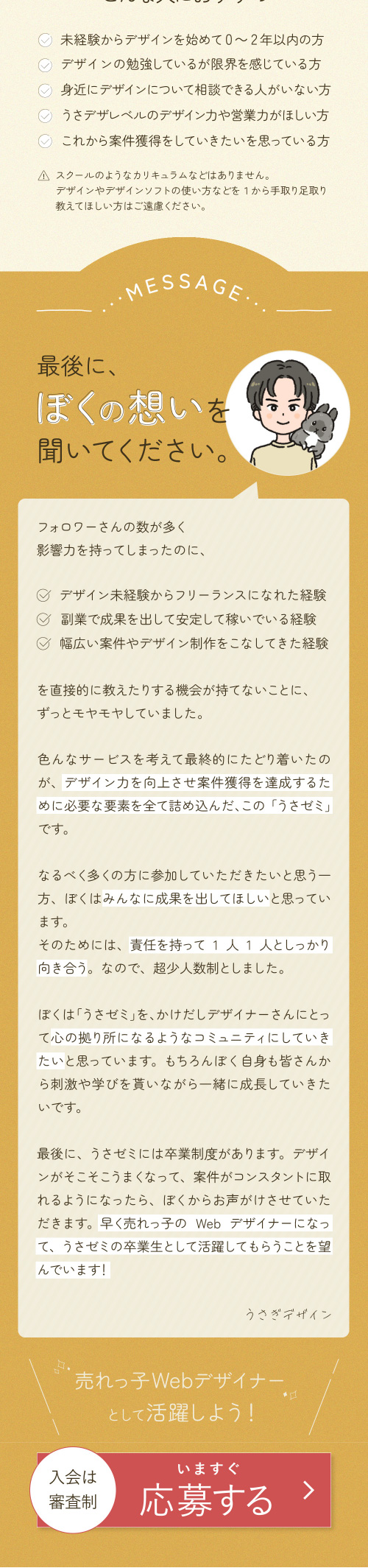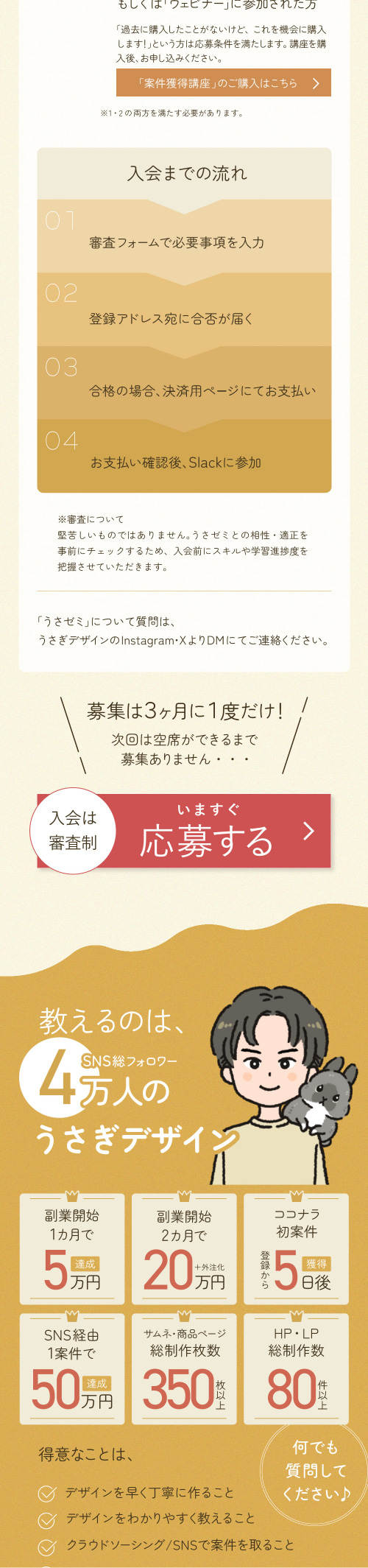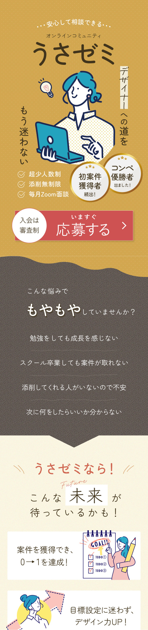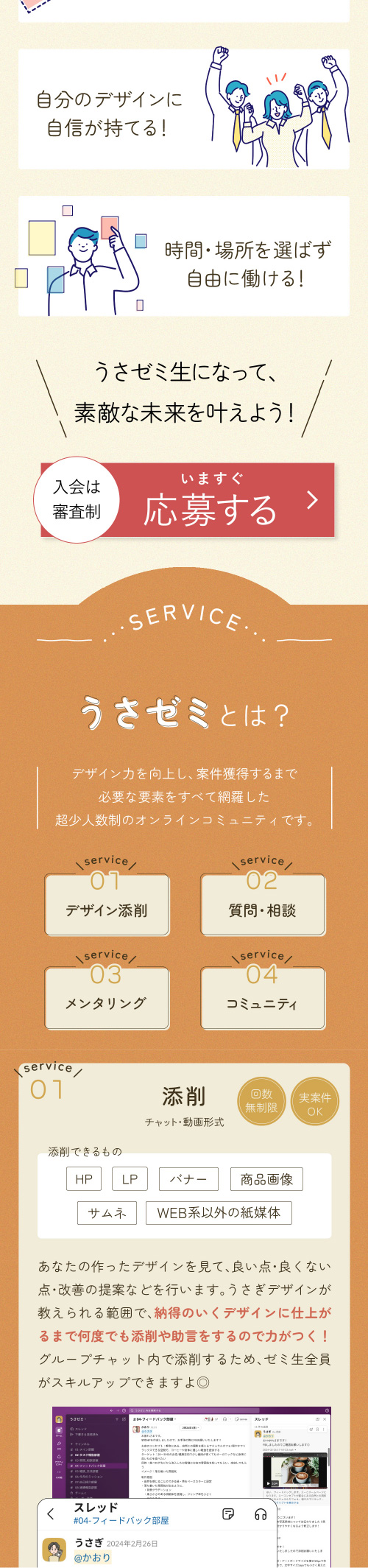 初めてのLP制作であり、構成を調べて情報設計を行なった。またライティングでは、上から読み進めた時に詰まることなく最後まで読み進めることのできるようユーザーの心理やCTAの位置を考えて作成。FVにはコミュニティ名と訴求ポイントを分かりやすく配置した。